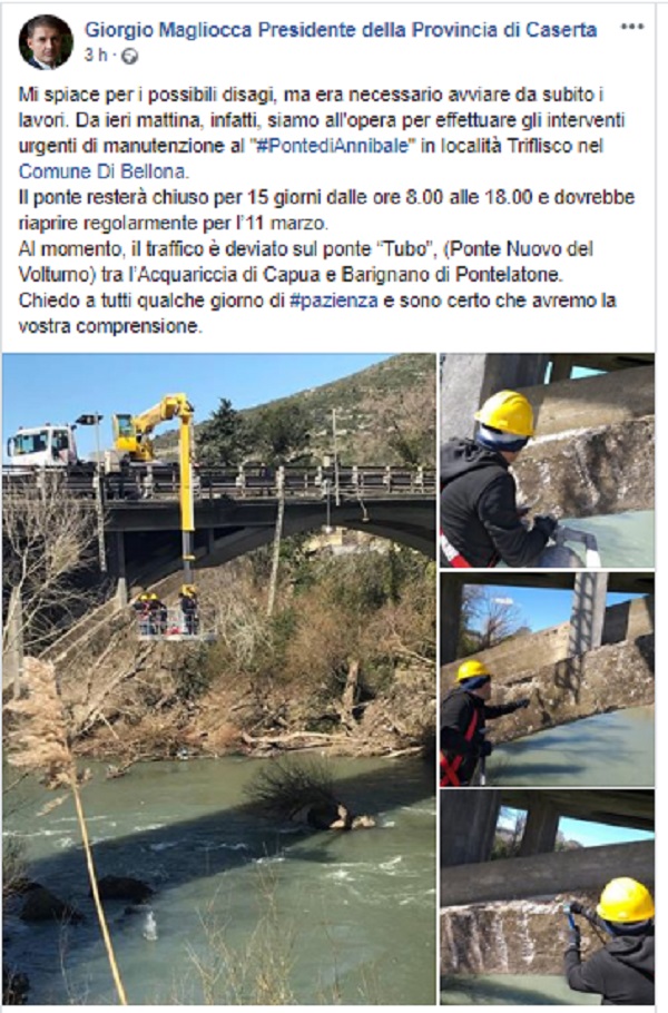 Questo il post pubblicato sulla pagina fb ufficiale del Presidente della Provincia di Caserta Giorgio Magliocca.