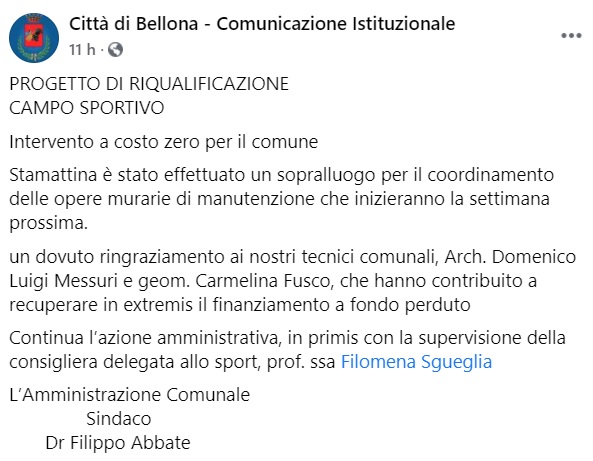 Questo quanto apprendiamo dalla pagina fb del Comune di Bellona: "PROGETTO DI RIQUALIFICAZIONE CAMPO SPORTIVO Intervento a costo zero per il comune Stamattina è stato effettuato un sopralluogo per il coordinamento delle opere murarie di manutenzione che inizieranno la settimana prossima. un dovuto ringraziamento ai nostri tecnici comunali, Arch. Domenico Luigi Messuri e geom. Carmelina Fusco, che hanno contribuito a recuperare in extremis il finanziamento a fondo perduto Continua l’azione amministrativa, in primis con la supervisione della consigliera delegata allo sport, prof. ssa Filomena Sgueglia L’Amministrazione Comunale Sindaco Dr Filippo Abbate"