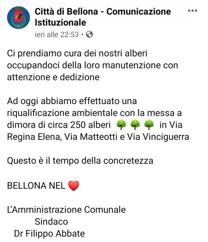 "Ci prendiamo cura dei nostri alberi occupandoci della loro manutenzione con attenzione e dedizione Ad oggi abbiamo effettuato una riqualificazione ambientale con la messa a dimora di circa 250 alberi in Via Regina Elena, Via Matteotti e Via Vinciguerra Questo è il tempo della concretezza...