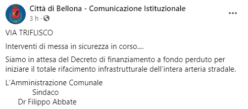 Questo il post pubblicato sulla pagina Facebook 'Città di Bellona - Comunicazione istituzionale': "Via Triflisco. Interventi di messa in sicurezza in corso.... Siamo in attesa del Decreto di finanziamento a fondo perduto per iniziare - si legge nel post - il totale rifacimento infrastrutturale dell’intera arteria stradale. L’Amministrazione Comunale. Sindaco Dr Filippo Abbate".
