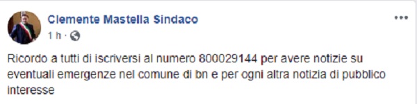 Questo il post pubblicato sulla pagina fb ufficiale del Sindaco di Benevento Clemente Mastella.