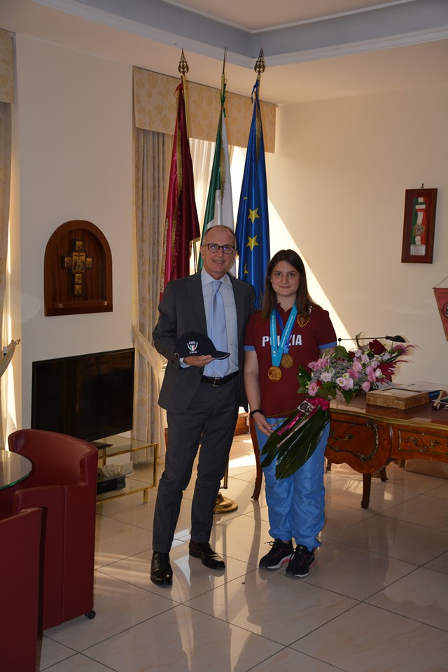 "Il Questore Luigi Bonagura ha rivevuto Maria Varricchio, la giovane tiratrice sannita che si è contraddistinta alle recenti Universiadi di Napoli con la medaglia di bronzo nella gara a squadre mista di tiro a segno, specialità pistola 10 metri. Non solo Universiade, Maria, la scorsa settimana, ha conquistato a Suhl (Germania) durante la Coppa del Mondo Juniores, la medaglia d’oro a squadre nella categoria Juniores Donne - pistola ad aria compressa a 10 metri, stabilendo il nuovo record europeo. Il Questore ha avuto espressioni di orgoglio complimentandosi per i successi conseguiti "Lo sport, strumento di aggregazione e di valorizzazione dello spirito di solidarietà, è un valido veicolo di contrasto ad ogni forma di violenza e di discriminazione".