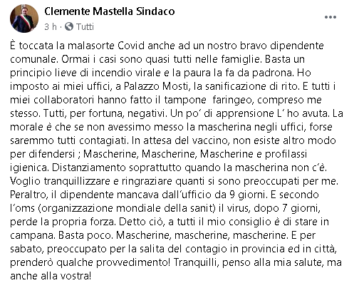 Lo apprendiamo dalla pagina Facebook del Sindaco di Benevento, Clemente Mastella.