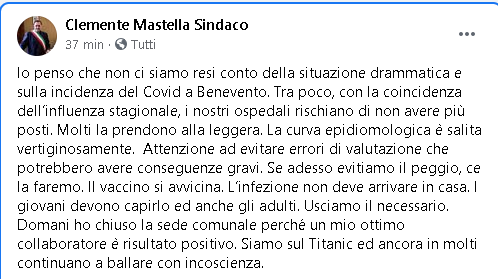 Lo apprendiamo dalla pagina Facebook del Sindaco di Benevento, Clemente Mastella.