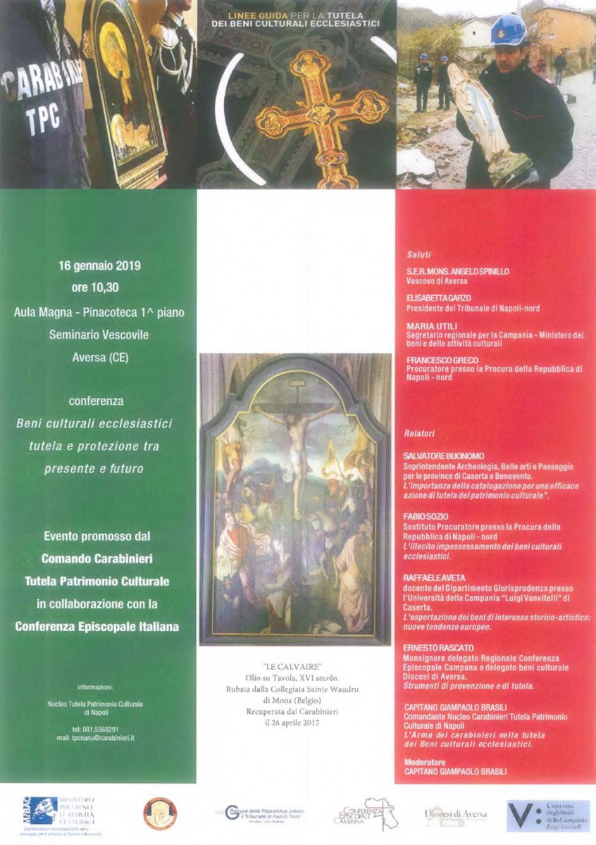 "Rafforzare la cultura e la sensibilità nella tutela di uno dei più importanti settori del patrimonio culturale nazionale: quello ecclesiastico. Con questa finalità, l’Ufficio Nazionale per i beni culturali ecclesiastici e l’edilizia di culto della CEI e il Comando Carabinieri Tutela Patrimonio Culturale hanno promosso, a livello regionale,-spiega la nota- il ciclo di conferenze “Beni culturali ecclesiastici, tutela e protezione tra presente e futuro”, in collaborazione con le Conferenze Episcopali Regionali, le Diocesi, gli Uffici Giudiziari, le articolazioni delMinistero per i beni e le attività culturali e l’Università.-spiega la nota-Il ciclo in questione farà tappa anche ad Aversa mercoledì prossimo, 16 gennaio 2019 alle ore 10.30, presso la Pinacoteca del Seminario Vescovile di Aversa. La Conferenza, come negli altri appuntamenti del ciclo avviato il 10 ottobre scorso ad Ancona e che si chiuderà a Torino il 24 gennaio, s’intitola appunto “Beni culturali ecclesiastici, tutela e protezione tra presente e futuro”, -spiega la nota-e si inserisce nell’ambito della pluriennale fruttuosa collaborazione tra CEI e MiBAC e nell’alveo della sinergia che, parimenti, caratterizza l’operato delle Soprintendenze, degli Uffici diocesani per i beni culturali e l’edilizia di culto e delle articolazioni territoriali del Comando Carabinieri Tutela Patrimonio Culturale.-si legge nella nota-Diversi i relatori che saranno chiamati ad intervenire ciascuno su uno specifico argomento d’interesse: l’arch. Salvatore Buonomo, Dirigente Soprintendenza Archeologia, Belle Arti e Paesaggio per le Province di Caserta e Benevento, sull’ “Importanza della catalogazione per una efficace azione di tutela del patrimonio culturale”;-spiega la nota- il dott. Fabio Sozio, Sostituto Procuratore – Procura di Napoli Nord, sulla “Contraffazione di opere d’arte e beni archeologici: aspetti penalistici”; il prof. Raffaele Aveta, Dipartimento Giurisprudenza Università Vanvitelli di Caserta, sulla “Circolazione dei beni culturali ecclesiastici”; Mons. Ernesto Rascato, Delegato Beni Culturali della Conferenza Episcopale Campana, sugli -spiega la nota-“Strumenti di prevenzione e di tutela”. A moderare la tavola rotonda sarà il Cap. Giampaolo Brasili, Comandante del Nucleo Tutela Patrimonio Culturale di Napoli, che relazionerà anche sul tema “L’Arma dei Carabinieri nella tutela dei beni culturali ecclesiastici”.-si legge nella nota-Previsti anche i saluti di S.E.Mons. Angelo Spinillo, Vescovo di Aversa, della dott.ssa Elisabetta Garzo, Presidente del Tribunale di Napoli Nord, del dott. Francesco Greco, Procuratore della Repubblica di Napoli Nord, e della dott.ssa Maria Utili, Direttore Segretariato Regionale del MiBAC per la Campania.-spiega la nota-Al termine della conferenza ci sarà la possibilità di visitare un’esposizione di opere ecclesiastiche (sculture, dipinti e marmi) ritrovati dal Comando Tutela Patrimonio Culturale nel corso degli anni (dal 1980 ad oggi). L’iniziativa vuole dunque focalizzare l’attenzione sul fenomeno dei furti e dei danneggiamenti in danno di chiese e luoghi di culto ove la fragilità del patrimonio culturale è ulteriormente messa a repentaglio dalla fruizione devozionale e liturgica dei beni ecclesiastici. -spiega la nota-Grazie alla pluralità di visioni, assicurata da illustri relatori provenienti dal mondo ecclesiastico, giudiziario, ministeriale, accademico e operativo, il tema “Beni culturali ecclesiastici, tutela e protezione tra presente e futuro” sarà declinato in tutte le sue sfaccettature, con particolare focus sulle buone pratiche e le criticità del settore.-spiega la nota-Infine, il ciclo di conferenza rappresenta un’ulteriore qualificata occasione per sostenere le attività di catalogazione del patrimonio culturale ecclesiastico, da tempo promosse dalla CEI, e per diffondere i consigli contenuti nella pubblicazione “Linee guida sulla tutela dei beni culturali ecclesiastici” realizzata, nel 2014, dal Comando Carabinieri Tutela Patrimonio Culturale, in collaborazione con l’Ufficio Nazionale per i beni culturali ecclesiastici e l’edilizia di culto."