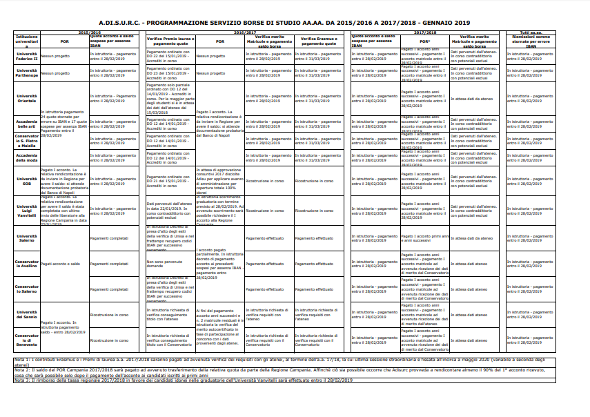 "Importante notizia per gli studenti che in questi giorni mi stanno chiedendo informazioni circa il pagamento delle borse di studio per l’anno accademico 2018/2019. La Regione ha provveduto infatti a effettuare il decreto di liquidazione delle risorse (DD Adg Fse n. 457 del 13.12.2018) e a breve partirà il mandato di pagamento che metterà i fondi a disposizione di Adisurs Campania. Ovviamente vi terremo aggiornati sulla situazione. Intanto condivido con voi questo schema riassuntivo dello stato di avanzamento dei procedimenti e dei pagamenti residui delle borse per gli anni accademici 2015/2016, 2016/2017 e 2017/2018. Se qualcuno dovesse trovarlo poco leggibile attraverso Facebook, può scaricarlo in versione pdf all’indirizzo https://www.adisurcampania.it/moduli/output_immagine.php…."
