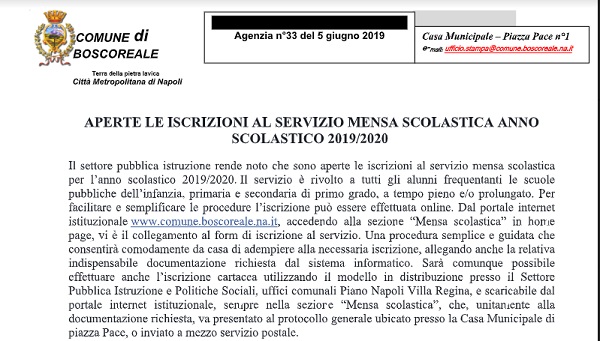 Questo il comunicato inviatoci dall'Ufficio Stampa del Comune di Boscoreale.