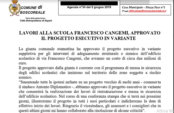 Questo il comunicato inviatoci dall'Ufficio Stampa del Comune di Boscoreale.