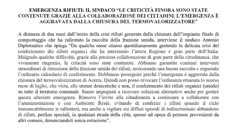 Questa è la nota stampa del Comune di Boscoreale: