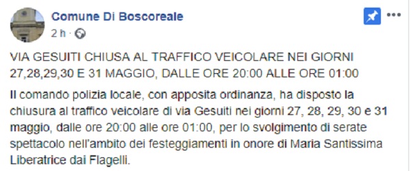 Questo il post pubblicato sulla pagina fb ufficiale del Comune di Boscoreale.