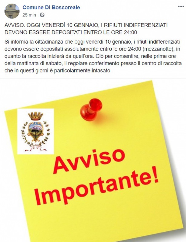 Questo quanto appreso dalla pagina facebook del Comune di Boscoreale:
