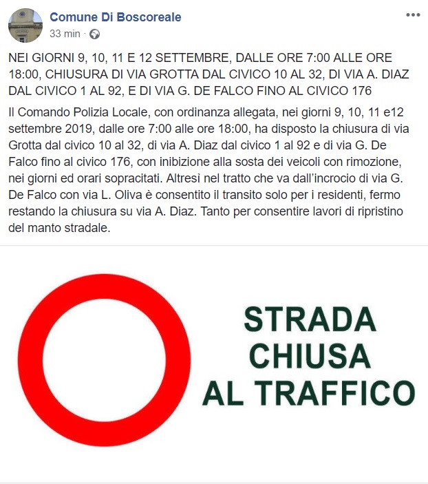 Questo quanto pubblicato sulla pagina Facebook del Comune di Boscoreale: