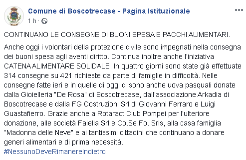 "Anche oggi i volontari della protezione civile sono impegnati nella consegna dei buoni spesa agli aventi diritto. Continua inoltre anche l’iniziativa CATENA ALIMENTARE SOLIDALE. In quattro giorni sono state già effettuate 314 consegne su 421 richieste da parte di famiglie in difficoltà. Nelle consegne fatte ieri e in quelle di oggi ci sono anche uova pasquali donate dalla Gioielleria “De Rosa” di Boscotrecase, dall’associazione Arkadia di Boscotrecase e dalla FG Costruzioni Srl di Giovanni Ferraro e Luigi Guastafierro. Grazie anche a Rotaract Club Pompei per l’ulteriore donazione, alle società Faiella Srl e Co.Se.Fo. Srls, alla casa famiglia “Madonna delle Neve” e ai tantissimi cittadini che continuano a donare generi alimentari e di prima necessità."