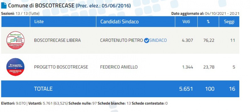 Concluso lo scrutinio a Boscotrecase, e Pietro Carotenuto è stato eletto Sindaco.