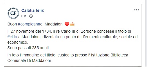 Ecco il testo: "Buon #compleanno, Maddaloni Il 27 novembre del 1734, il re Carlo III di Borbone concesse il titolo di #città a Maddaloni, diventata un punto di riferimento culturale, sociale ed economico. Sono passati 285 anni! In foto l'immagine del titolo, custodito presso l' Istituzione Biblioteca Comunale Di Maddaloni".