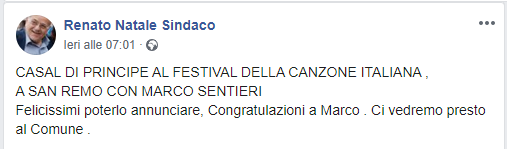 "CASAL DI PRINCIPE AL FESTIVAL DELLA CANZONE ITALIANA, A SANREMO CON MARCO SENTIERI. Felicissimi poterlo annunciare, Congratulazioni a Marco. Ci vedremo presto al Comune."