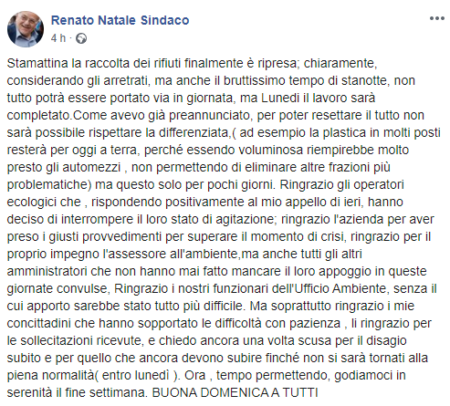 "Stamattina la raccolta dei rifiuti finalmente è ripresa; chiaramente, considerando gli arretrati, ma anche il bruttissimo tempo di stanotte, non tutto potrà essere portato via in giornata, ma Lunedi il lavoro sarà completato.Come avevo già preannunciato, per poter resettare il tutto non sarà possibile rispettare la differenziata, (ad esempio la plastica in molti posti resterà per oggi a terra, perché essendo voluminosa riempirebbe molto presto gli automezzi, non permettendo di eliminare altre frazioni più problematiche) ma questo solo per pochi giorni. Ringrazio gli operatori ecologici che, rispondendo positivamente al mio appello di ieri, hanno deciso di interrompere il loro stato di agitazione; ringrazio l'azienda per aver preso i giusti provvedimenti per superare il momento di crisi, ringrazio per il proprio impegno l'assessore all'ambiente,ma anche tutti gli altri amministratori che non hanno mai fatto mancare il loro appoggio in queste giornate convulse, Ringrazio i nostri funzionari dell'Ufficio Ambiente, senza il cui apporto sarebbe stato tutto più difficile. Ma soprattutto ringrazio i mie concittadini che hanno sopportato le difficoltà con pazienza, li ringrazio per le sollecitazioni ricevute, e chiedo ancora una volta scusa per il disagio subito e per quello che ancora devono subire finché non si sarà tornati alla piena normalità(entro lunedì ). Ora, tempo permettendo, godiamoci in serenità il fine settimana. BUONA DOMENICA A TUTTI".
