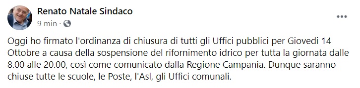 "Oggi ho firmato l'ordinanza di chiusura di tutti gli Uffici pubblici per Giovedi 14 Ottobre a causa della sospensione del rifornimento idrico per tutta la giornata dalle 8.00 alle 20.00, -si legge nella nota- così come comunicato dalla Regione Campania. Dunque saranno chiuse tutte le scuole, le Poste, l'Asl, gli Uffici comunali."