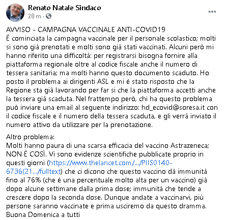 [email protected] con il codice fiscale e il numero della tessera scaduta, e gli verrà inviato il numero attivo da utilizzare per la prenotazione. Altro problema: Molti hanno paura di una scarsa efficacia del vaccino Astrazeneca; NON È COSÌ. Vi sono evidenze scientifiche pubblicate proprio in questi giorni (https://www.thelancet.com/.../PIIS0140-6736(21.../fulltext) che ci dicono che questo vaccino dà immunità fino al 76% (che è una percentuale molto alta per un vaccino) già dopo alcune settimane dalla prima dose; immunità che tende a crescere dopo la seconda dose. Dunque andate a vaccinarvi, più persone saranno vaccinate e prima usciremo da questo dramma. Buona Domenica a tutti".