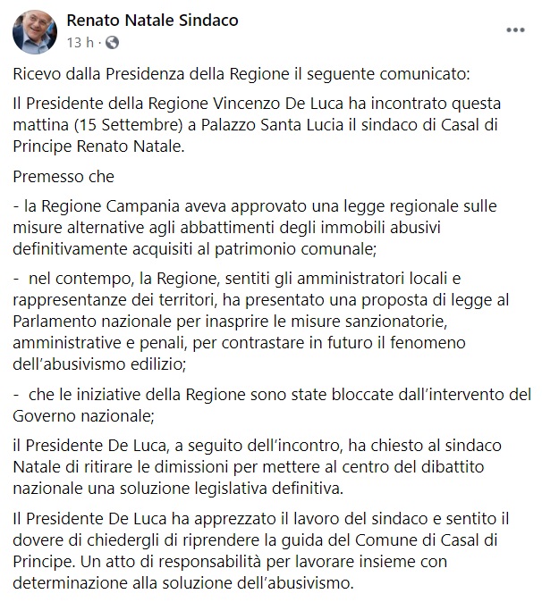 "Ricevo dalla Presidenza della Regione il seguente comunicato: Il Presidente della Regione Vincenzo De Luca ha incontrato questa mattina (15 Settembre) a Palazzo Santa Lucia il sindaco di Casal di Principe Renato Natale. Premesso che - la Regione Campania aveva approvato- si legge nella nota- una legge regionale sulle misure alternative agli abbattimenti degli immobili abusivi definitivamente acquisiti al patrimonio comunale; - nel contempo, la Regione, sentiti gli amministratori locali e rappresentanze dei territori, ha presentato una proposta di legge al Parlamento nazionale per inasprire le misure sanzionatorie, amministrative e penali, per contrastare in futuro il fenomeno dell’abusivismo edilizio; - che le iniziative della Regione sono state bloccate dall’intervento del Governo nazionale; il Presidente De Luca, a seguito dell’incontro, ha chiesto al sindaco Natale di ritirare le dimissioni per mettere al centro del dibattito nazionale una soluzione legislativa definitiva. Il Presidente De Luca ha apprezzato- si legge nella nota- il lavoro del sindaco e sentito il dovere di chiedergli di riprendere la guida del Comune di Casal di Principe. Un atto di responsabilità per lavorare insieme con determinazione alla soluzione dell’abusivismo."