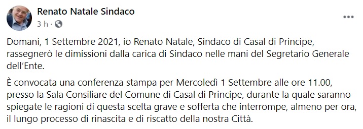 Questo quanto apprendiamo dalla pagina fb del Sindaco Natale: "Domani, 1 Settembre 2021, io Renato Natale, Sindaco di Casal di Principe, rassegnerò le dimissioni dalla carica di Sindaco - si legge nella nota - nelle mani del Segretario Generale dell’Ente. È convocata una conferenza stampa per Mercoledì 1 Settembre alle ore 11.00, presso la Sala Consiliare del Comune di Casal di Principe, durante la quale saranno spiegate le ragioni di questa scelta grave e sofferta che interrompe, almeno per ora, il lungo processo di rinascita - si legge nella nota - e di riscatto della nostra Città."