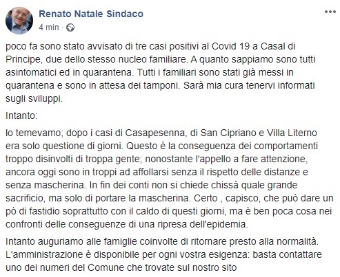 Questo quanto pubblicato sulla pagina facebook del Sindaco Natale: