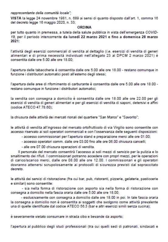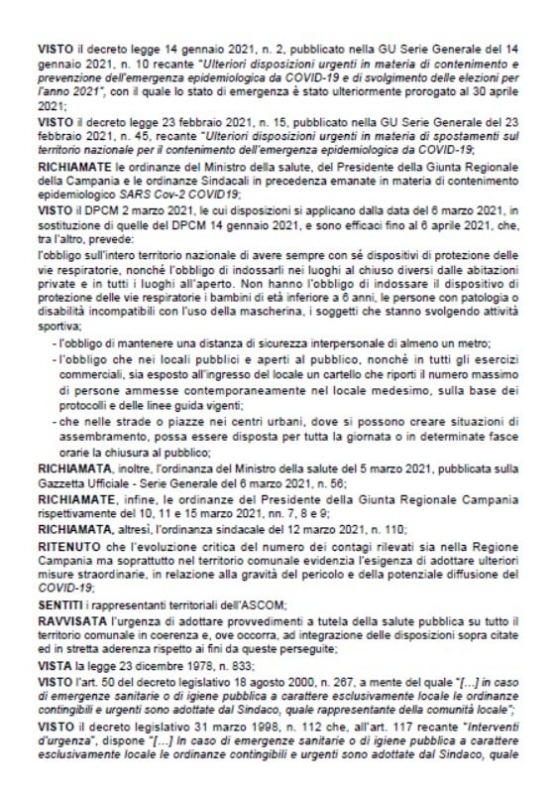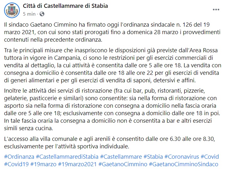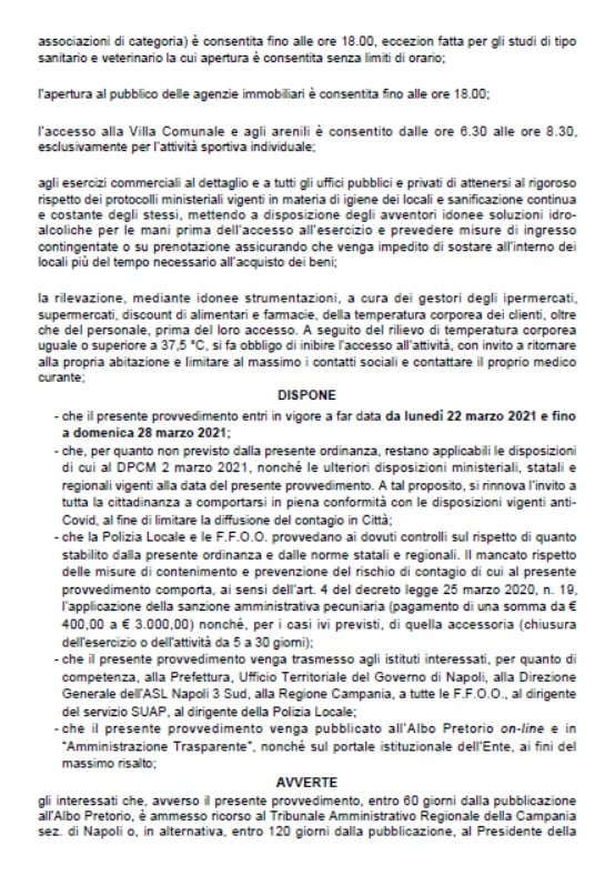 "Il sindaco Gaetano Cimmino ha firmato oggi l’ordinanza sindacale n. 126 del 19 marzo 2021, con cui sono stati prorogati fino a domenica 28 marzo i provvedimenti contenuti nella precedente ordinanza. -Si legge nella nota- Tra le principali misure che inaspriscono le disposizioni già previste dall’Area Rossa tuttora in vigore in Campania, ci sono le restrizioni per gli esercizi commerciali di vendita al dettaglio, la cui attività è consentita dalle ore 5 alle ore 18. La vendita con consegna a domicilio è consentita dalle ore 18 alle ore 22 per gli esercizi di vendita di generi alimentari e per gli esercizi di vendita di saponi, detersivi e affini. -Si legge nella nota- Inoltre le attività dei servizi di ristorazione (fra cui bar, pub, ristoranti, pizzerie, gelaterie, pasticcerie e similari) sono consentite: sia nella forma di ristorazione con asporto sia nella forma di ristorazione con consegna a domicilio nella fascia oraria dalle ore 5 alle ore 18; esclusivamente con consegna a domicilio dalle ore 18 in poi. -Si legge nella nota- In tale fascia oraria la consegna a domicilio non è consentita a bar e altri esercizi simili senza cucina. L’accesso alla villa comunale e agli arenili è consentito dalle ore 6.30 alle ore 8.30, esclusivamente per l’attività sportiva individuale."