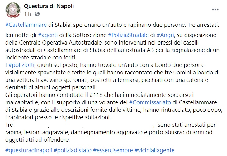 Questo parte di quanto pubblicato sulla pagina facebook della Questura di Napoli: