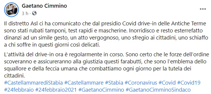 "Il distretto Asl ci ha comunicato che dal presidio Covid drive-in delle Antiche Terme sono stati rubati tamponi, test rapidi e mascherine. Inorridisco e resto esterrefatto dinanzi ad un simile gesto, un atto vergognoso, uno sfregio- si legge nella nota- ai cittadini, uno schiaffo a chi soffre in questi giorni così delicati. L'attività del drive-in ora è regolarmente in corso. Sono certo che le forze dell’ordine scoveranno e assicureranno alla giustizia questi farabutti, che sono l’emblema dello squallore e della feccia umana che combattiamo ogni giorno per la tutela dei cittadini."