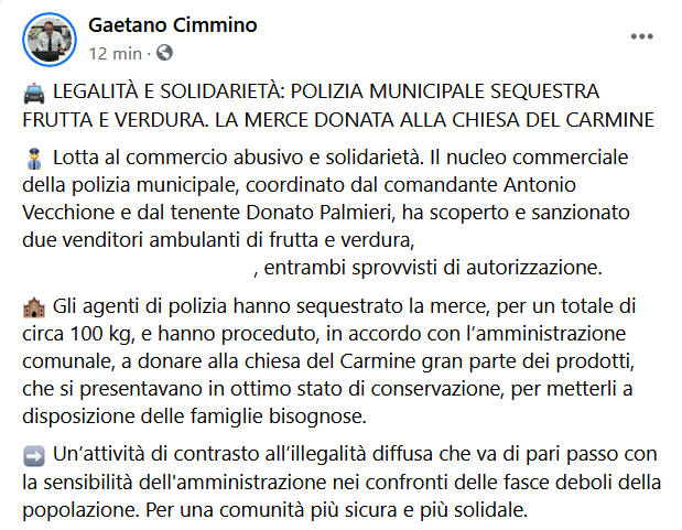 Questo il post pubblicato sulla pagina Facebook del sindaco di Castellammare di Stabia, Gaetano Cimmino: "LEGALITÀ E SOLIDARIETÀ: POLIZIA MUNICIPALE SEQUESTRA FRUTTA E VERDURA. LA MERCE DONATA ALLA CHIESA DEL CARMINE. Lotta al commercio abusivo e solidarietà. Il nucleo commerciale della polizia municipale, coordinato dal comandante Antonio Vecchione e dal tenente Donato Palmieri, ha scoperto e sanzionato - si legge - due venditori ambulanti di frutta e verdura, (...), entrambi sprovvisti di autorizzazione. Gli agenti di polizia hanno sequestrato la merce, per un totale di circa 100 kg, e hanno proceduto, in accordo con l’amministrazione comunale, a donare alla chiesa del Carmine gran parte dei prodotti, che si presentavano in ottimo stato di conservazione, per metterli a disposizione delle famiglie bisognose. Un’attività - si legge - di contrasto all’illegalità diffusa che va di pari passo con la sensibilità dell'amministrazione nei confronti delle fasce deboli della popolazione. Per una comunità più sicura e più solidale.