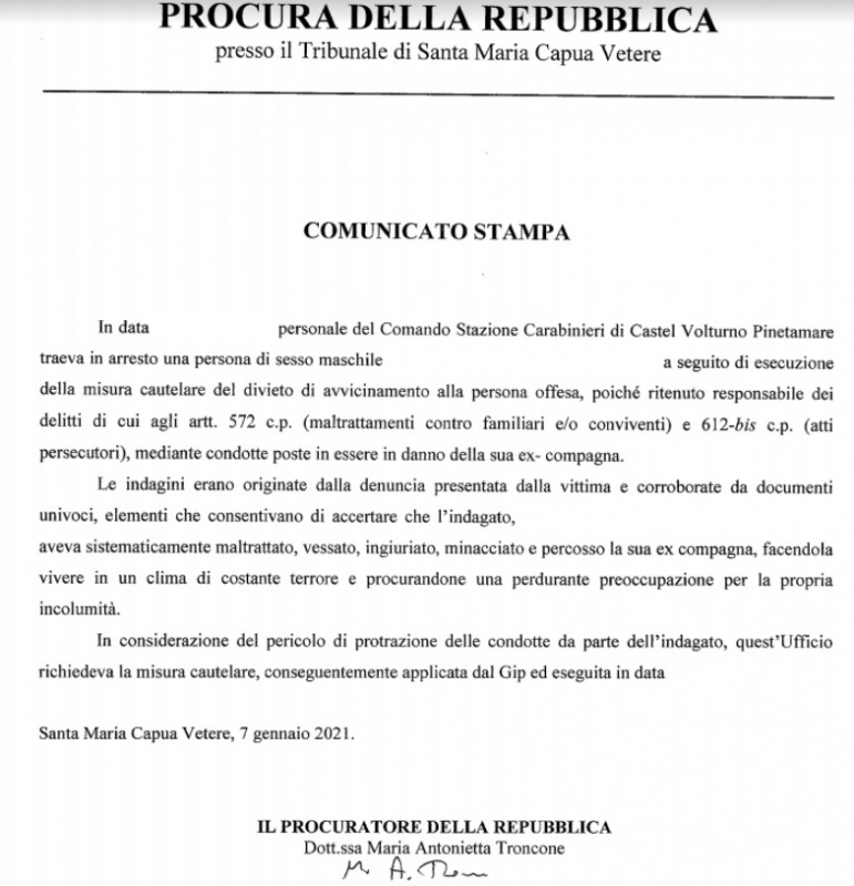 C.Volturno. "Aveva sistematicamente maltrattato, vessato, ingiuriato, minacciato e percosso la sua ex compagna". Uomo nei guai