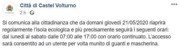Questo quanto apprendiamo dalla pagina facebook del Comune di Castel Volturno: