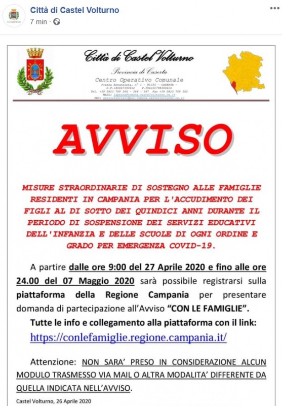 Questo quanto apprendiamo dalla pagina facebook del Comune di Castel Volturno: