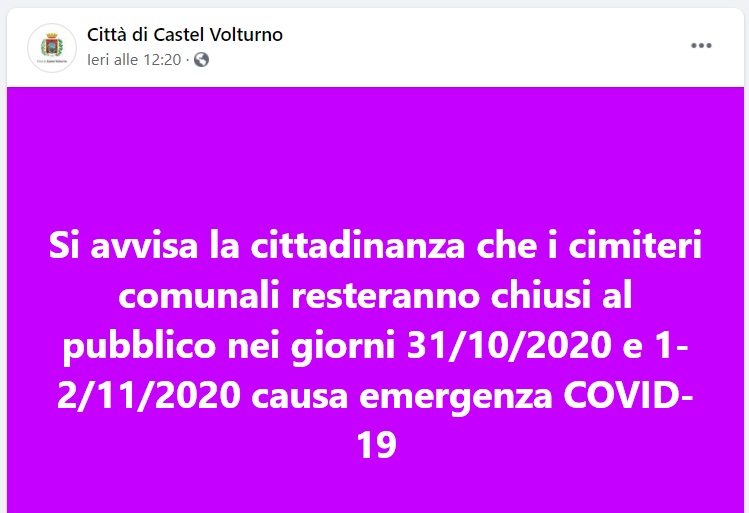Questo quanto pubblicato sulla pagina FB del Comune di C.Volturno