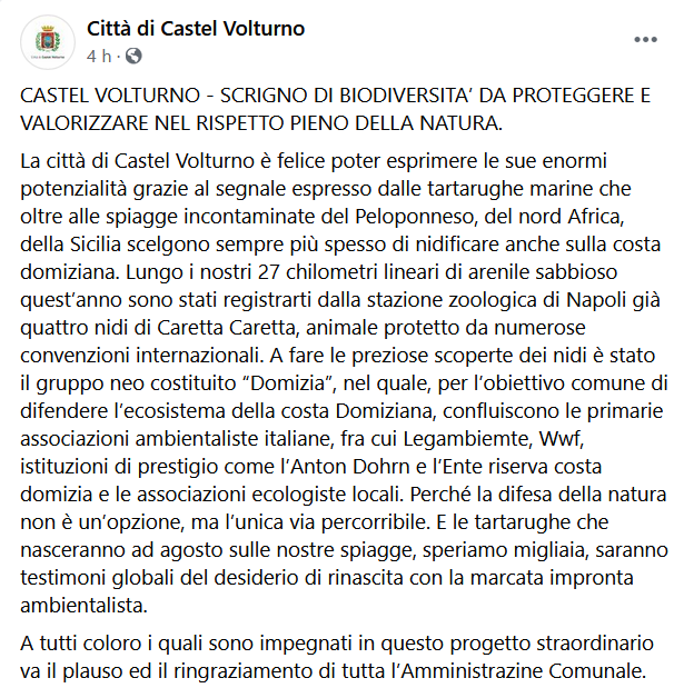 Questo il post pubblicato dalla pagina Facebook della Città di Castel Volturno: " CASTEL VOLTURNO - SCRIGNO DI BIODIVERSITA’ DA PROTEGGERE E VALORIZZARE NEL RISPETTO PIENO DELLA NATURA. La città di Castel Volturno è felice poter esprimere le sue enormi potenzialità grazie al segnale espresso dalle tartarughe marine che oltre alle spiagge incontaminate del Peloponneso, del nord Africa, della Sicilia scelgono sempre più spesso di nidificare anche sulla costa domiziana. Lungo i nostri 27 chilometri lineari di arenile sabbioso - si legge nel post - quest’anno sono stati registrarti dalla stazione zoologica di Napoli già quattro nidi di Caretta Caretta, animale protetto da numerose convenzioni internazionali. A fare le preziose scoperte dei nidi - continua il post - è stato il gruppo neo costituito “Domizia”, nel quale, per l’obiettivo comune di difendere l’ecosistema della costa Domiziana, confluiscono le primarie associazioni ambientaliste italiane, fra cui Legambiemte, Wwf, istituzioni di prestigio come l’Anton Dohrn e l’Ente riserva costa domizia e le associazioni ecologiste locali. Perché la difesa della natura non è un’opzione, ma l’unica via percorribile. E le tartarughe che nasceranno ad agosto sulle nostre spiagge - conclude il post - speriamo migliaia, saranno testimoni globali del desiderio di rinascita con la marcata impronta ambientalista. A tutti coloro i quali sono impegnati in questo progetto straordinario va il plauso ed il ringraziamento di tutta l’Amministrazine Comunale".