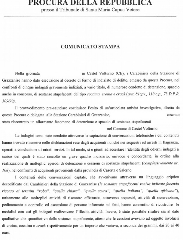 C.Volturno. "Molteplici episodi di detenzione e cessioni di sostanze stupefacenti". In 5 nei guai