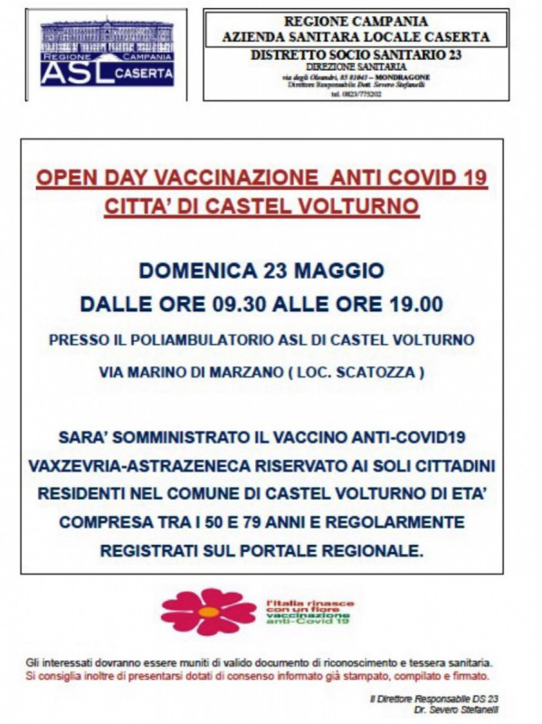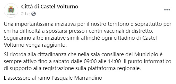 Questo quanto pubblicato sulla pagina fb del Comune di C.Volturno: "Una importantissima iniziativa per il nostro territorio e soprattutto per chi ha difficoltà a spostarsi presso i centri vaccinali di distretto - si legge nella nota -. Seguiranno altre iniziative simili affinché ogni cittadino di Castel Volturno venga raggiunto. Si ricorda alla cittadinanza che nella sala consiliare del Municipio è sempre attivo fino a sabato dalle 09:00 alle 14:00 il punto informatico di supporto alla registrazione sulla piattaforma regionale - si legge nella nota -. L’assessore al ramo Pasquale Marrandino".