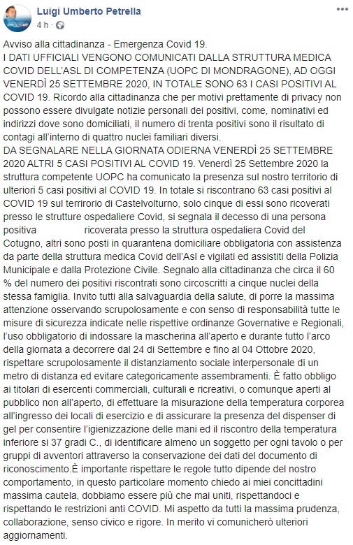 Questo parte di quanto apprendiamo dalla pagina facebook del Sindaco Petrella: