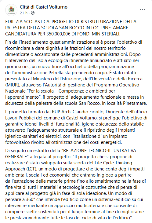 Questo il post pubblicato sulla pagina Facebook della Città di Castelvolturno: "EDILIZIA SCOLASTICA: PROGETTO DI RISTRUTTURAZIONE DELLA PALESTRA DELLA SCUOLA SAN ROCCO IN LOC. PINETAMARE. CANDIDATURA PER 350.000,00€ DI FONDI MINISTERIALI. Fin dall’insediamento quest’amministrazione si è posta l’obiettivo di ricominciare a dare dignità alle frazioni del nostro territorio dimenticate o accantonate dalle precedenti amministrazioni. Dopo l’intervento dell’isola ecologica itinerante - si legge - annunciato e attuato nei giorni scorsi, un nuovo fiore all’occhiello della programmazione dell’amministrazione Petrella sta prendendo corpo. È stato infatti presentato al Ministero dell’Istruzione, dell’Università e della Ricerca (MIUR), attraverso l’Autorità di gestione del Programma Operativo Nazionale “Per la scuola – Competenze e ambienti per l’apprendimento”, il progetto di adeguamento funzionale e messa in sicurezza della palestra della scuola San Rocco, in località Pinetamare. Il progetto - continua - firmato dal RUP Arch. Claudio Fiorillo, Dirigente dell’ufficio Lavori Pubblici del comune di Castel Volturno, si prefigge l’obiettivo di garantire idonei livelli di funzionalità, igiene e sicurezza dello stabile attraverso l’adeguamento strutturale e il ripristino degli impianti igienico-sanitari ed elettrici, con l’istallazione di un impianto fotovoltaico rivolto all’ottimizzazione dei costi energetici. Di seguito - poi - un estratto della “RELAZIONE TECNICO-ILLUSTRATIVA GENERALE” allegata al progetto: “Il progetto che si propone di realizzare è stato sviluppato sulla scorta del Life Cycle Thinking Approach (LCT), un modo di progettare che tiene conto degli impatti ambientali, sociali ed economici che entrano in gioco a partire dall’estrazione delle materie prime fino allo smaltimento nella fase di fine vita di tutti i materiali e tecnologie costruttive che si pensa di applicare al progetto già in fase di sola ideazione. Un modo di pensare a 360° che - conclude - intende l’edificio come un sistema-edificio su cui intervenire mediante un approccio multicriteriale che consente di compiere scelte sostenibili per il lungo termine al fine di migliorarne le prestazioni durante tutte le fasi del ciclo di vita dell'edificio”.