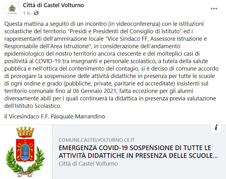 Questo quanto apprendiamo dalla pagina facebook del Comune di Castel Volturno: