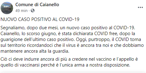 Questo il post pubblicato sulla pagina Facebook 'Comune di Caianello: "NUOVO CASO POSITIVO AL COVID-19. Segnaliamo, dopo due mesi, un nuovo caso positivo al COVID-19. Caianello, lo scorso giugno - si legge nel post - è stata dichiarata COVID free, dopo la guarigione dell’ultimo caso positivo. Oggi, purtroppo, il COVID torna sul territorio ricordandoci che il virus è ancora tra noi e che dobbiamo mantenere ancora alta la guardia. Ciò ci deve indurre - conclude il post - ancora di più a credere nel vaccino e l’appello è quello di vaccinarsi perché è l’unica arma a nostra disposizione".
