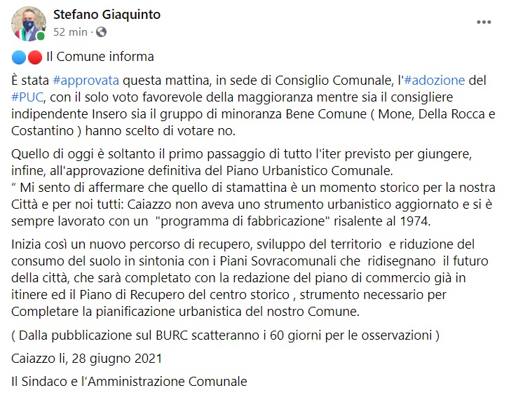 "Il Comune informa È stata #approvata questa mattina, in sede di Consiglio Comunale, l'#adozione del #PUC, con il solo voto favorevole della maggioranza mentre sia il consigliere indipendente Insero sia il gruppo di minoranza Bene Comune ( Mone, Della Rocca e Costantino ) hanno scelto di votare no. Quello di oggi è soltanto il primo passaggio di tutto l'iter previsto per giungere, infine, all'approvazione definitiva del Piano Urbanistico Comunale. -Si legge nella nota- “ Mi sento di affermare che quello di stamattina è un momento storico per la nostra Città e per noi tutti: Caiazzo non aveva uno strumento urbanistico aggiornato e si è sempre lavorato con un "programma di fabbricazione" risalente al 1974. Inizia così un nuovo percorso di recupero, sviluppo del territorio e riduzione del consumo del suolo in sintonia con i Piani Sovracomunali che ridisegnano il futuro della città, che sarà completato con la redazione del piano di commercio già in itinere ed il Piano di Recupero del centro storico , -si legge nella nota- strumento necessario per Completare la pianificazione urbanistica del nostro Comune. ( Dalla pubblicazione sul BURC scatteranno i 60 giorni per le osservazioni ) Caiazzo li, 28 giugno 2021 Il Sindaco e l’Amministrazione Comunale"