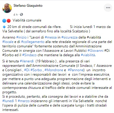 Questo il post pubblicato dal Sindaco di Caiazzo Stefano Giaquinto sulla sua pagina Facebook: "Viabilità comunale: 20 km di strade comunali da rifare. Si inizia lunedì 1 marzo da Via Selvetelle ( dal semaforo fino alla località Scalzatoio ). Avranno inizio i "Lavori di messa in sicurezza - si legge nel post - della viabilità locale e di collegamento alla rete stradale regionale di una parte del territorio comunale” fortemente sostenuto dall’Amministrazione Comunale in sinergia con l’Assessore ai Lavori Pubblici Giovanni Di Sorbo ed il Sindaco che mantiene la delega alla viabilità. Si è tenuta venerdì (19 febbraio) - prosegue il post - alla presenza di vari rappresentanti dell'Amministrazione Comunale (il Sindaco, l’ Assessore e Consiglieri, Di Sorbo, Mondrone e Pannone) un incontro organizzativo con i responsabili dei lavori e con l’impresa esecutrice, per mettere a punto una adeguata programmazione degli interventi e delineare una calendarizzazione degli stessi, onde evitare la contemporanea chiusura al traffico delle strade comunali interessate al progetto. Si è proceduto, pertanto, alla consegna dei lavori e a stabilire - conclude il post - che da lunedì 1 marzo inizieranno gli interventi in Via Selvetelle nonché l'opera di pulizia delle cunette e delle scarpate lungo i tratti stradali interessati".