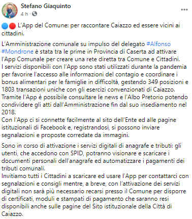 Questo il post pubblicato sulla sua pagina Facebook dal Sindaco di Caiazzo Stefano Giaquinto: "L’App del Comune: per raccontare Caiazzo ed essere vicini ai cittadini. L’Amministrazione comunale su impulso del delegato Alfonso Mondrone è stata tra le prime in Provincia di Caserta ad attivare l’App Comunale per creare una rete diretta tra Comune e Cittadini. I servizi disponibili - si legge nel post - con l’App sono stati utilizzati durante la pandemia per favorire l’accesso alle informazioni del contagio e coordinare i bonus alimentari per le famiglie in difficoltà, gestendo 349 posizioni e 1803 transazioni uniche con gli esercizi convenzionati di Caiazzo.