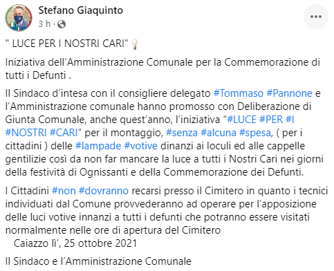 Iniziativa dell’Amministrazione Comunale per la Commemorazione di tutti i Defunti. Il Sindaco d’intesa con il consigliere delegato Tommaso Pannone e l’Amministrazione comunale hanno promosso - si legge nel post - con Deliberazione di Giunta Comunale, anche quest’anno, l’iniziativa 'Luce per i nostri cari' per il montaggio, senza alcuna spesa (per i cittadini) delle lampade votive - dinanzi ai loculi ed alle cappelle gentilizie così da non far mancare la luce a tutti i Nostri Cari nei giorni della festività di Ognissanti e della Commemorazione dei Defunti. I Cittadini - prosegue il post - non dovranno recarsi presso il Cimitero in quanto i tecnici individuati dal Comune provvederanno ad operare per l’apposizione delle luci votive innanzi a tutti i defunti che potranno essere visitati normalmente nelle ore di apertura - conclude il post - del Cimitero".