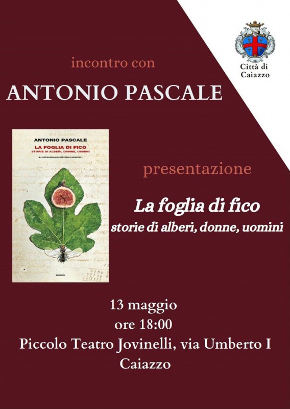 Questo il comunicato stampa diffuso dal Sindaco di Caiazzo Stefano Giaquinto: "Venerdì 13 maggio alle ore 18, nell'ambito dell'iniziativa ‘Maggio dei Libri’, presso il Piccolo Teatro Jovinelli di Caiazzo, verrà presentato l'ultimo libro di Antonio Pascale ‘La foglia di fico. Storie di alberi, donne, uomini’ edito da Einaudi e con illustrazioni - si legge nel comunicato - di Stefano Faravelli. Nato a Napoli e cresciuto a Caserta, nonostante viva a Roma dove lavora presso il ministero delle Politiche agricole e dove esercita la sua attività di scrittore, saggista ed autore teatrale e televisivo, Pascale in questo suo ultimo lavoro ritorna nelle sue terre d'origine e nei dieci racconti in cui si articola il libro, ognuno intitolato con nomi di piante, crea un connubio perfetto - prosegue il comunicato - tra la natura degli alberi e quella degli uomini. In quest'opera c’è una botanica dei sentimenti e una geografia degli affetti; più si va avanti nella lettura, più si avverte il desiderio di un intimo colloquio con la natura. L'incontro sarà aperto dal saluto del primo cittadino - si legge ancora nel comunicato - di Caiazzo Stefano Giaquinto e proseguirà con un dialogo tra l'autore e l'assessore Ida Sorbo".