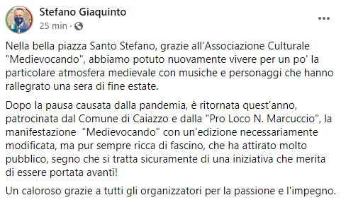 Questo il post pubblicato sulla sua pagina Facebook dal Sindaco di Caiazzo Stefano Giaquinto: "Nella bella piazza Santo Stefano, grazie all'Associazione Culturale "Medievocando", abbiamo potuto nuovamente vivere per un po' la particolare atmosfera medievale con musiche e personaggi che hanno rallegrato una sera di fine estate. Dopo la pausa causata dalla pandemia - si legge nel post - è ritornata quest'anno, patrocinata dal Comune di Caiazzo e dalla "Pro Loco N. Marcuccio", la manifestazione "Medievocando" con un'edizione necessariamente modificata, ma pur sempre ricca di fascino, che ha attirato molto pubblico, segno che si tratta sicuramente di una iniziativa che merita di essere portata avanti! Un caloroso grazie a tutti gli organizzatori - conclude il post - per la passione e l'impegno".