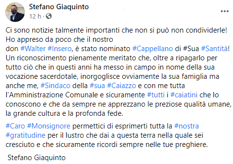 Questo il post pubblicato dal Sindaco di Caiazzo Stefano Giaquinto sulla sua pagina Facebook: "Ci sono notizie talmente importanti che non si può non condividerle! Ho appreso da poco che il nostro don Walter Insero, è stato nominato Cappellano di Sua Santità! Un riconoscimento pienamente meritato - si legge nel post - che, oltre a ripagarlo per tutto ciò che in questi anni ha messo in campo in nome della sua vocazione sacerdotale, inorgoglisce ovviamente la sua famiglia ma anche me, Sindaco della sua Caiazzo e con me tutta l'Amministrazione Comunale e sicuramente tutti i caiatini che lo conoscono - prosegue il post - e che da sempre ne apprezzano le preziose qualità umane, la grande cultura e la profonda fede. Caro Monsignore permettici di esprimerti tutta la nostra gratitudine per il lustro che dai a questa terra nella quale sei cresciuto e che sicuramente - conclude il post - ricordi sempre nelle tue preghiere. Stefano Giaquinto".