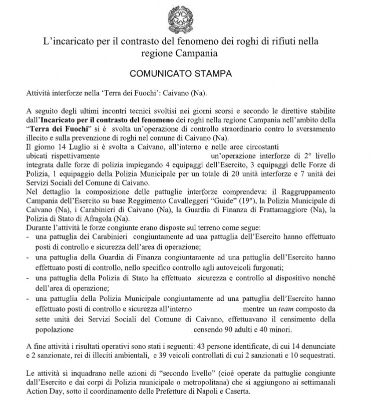 "Attività interforze nella ‘Terra dei Fuochi’: Caivano (Na). A seguito degli ultimi incontri tecnici svoltisi nei giorni scorsi e secondo le direttive stabilite dall’Incaricato per il contrasto del fenomeno dei roghi nella regione Campania nell’ambito della “Terra dei Fuochi” si è svolta un’operazione di controllo straordinario contro lo sversamento illecito e sulla prevenzione di roghi nel comune di Caivano (Na). Il giorno 14 Luglio si è svolta a Caivano, all’interno e nelle aree circostanti ... ubicati rispettivamente ... un’operazione interforze di 2° livello integrata dalle forze di polizia impiegando 4 equipaggi dell’Esercito, 3 equipaggi delle Forze di Polizia, 1 equipaggio della Polizia Municipale per un totale di 20 unità interforze e 7 unità dei Servizi Sociali del Comune di Caivano. Nel dettaglio la composizione delle pattuglie interforze comprendeva: il Raggruppamento Campania dell’Esercito su base Reggimento Cavalleggeri “Guide” (19°), la Polizia Municipale di Caivano (Na), i Carabinieri di Caivano (Na), la Guardia di Finanza di Frattamaggiore (Na), la Polizia di Stato di Afragola (Na). Durante l’attività le forze congiunte erano disposte sul terreno come segue: - una pattuglia dei Carabinieri congiuntamente ad una pattuglia dell’Esercito hanno effettuato posti di controllo e sicurezza dell’area di operazione; - una pattuglia della Guardia di Finanza congiuntamente ad una pattuglia dell’Esercito hanno effettuato posti di controllo, nello specifico controllo agli autoveicoli furgonati; - una pattuglia della Polizia di Stato ha effettuato sicurezza e controllo al dispositivo nonché dell’area di operazione; - una pattuglia della Polizia Municipale congiuntamente ad una pattuglia dell’Esercito hanno effettuato posti di controllo e sicurezza all’interno .. mentre un team composto da sette unità dei Servizi Sociali del Comune di Caivano, effettuavano il censimento della popolazione ... censendo 90 adulti e 40 minori. A fine attività i risultati operativi sono stati i seguenti: 43 persone identificate, di cui 14 denunciate e 2 sanzionate, rei di illeciti ambientali, e 39 veicoli controllati di cui 2 sanzionati e 10 sequestrati. Le attività si inquadrano nelle azioni di “secondo livello” (cioè operate da pattuglie congiunte dall’Esercito e dai corpi di Polizia municipale o metropolitana) che si aggiungono ai settimanali Action Day, sotto il coordinamento delle Prefetture di Napoli e Caserta."