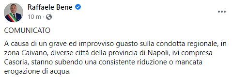 Questo il post pubblicato sulla sua pagina Facebook dal Sindaco di Casoria Raffaele Bene: "A causa di un grave ed improvviso guasto sulla condotta regionale - si legge nel post - in zona Caivano, diverse città della provincia di Napoli, ivi compresa Casoria, stanno subendo una consistente riduzione o mancata erogazione di acqua".